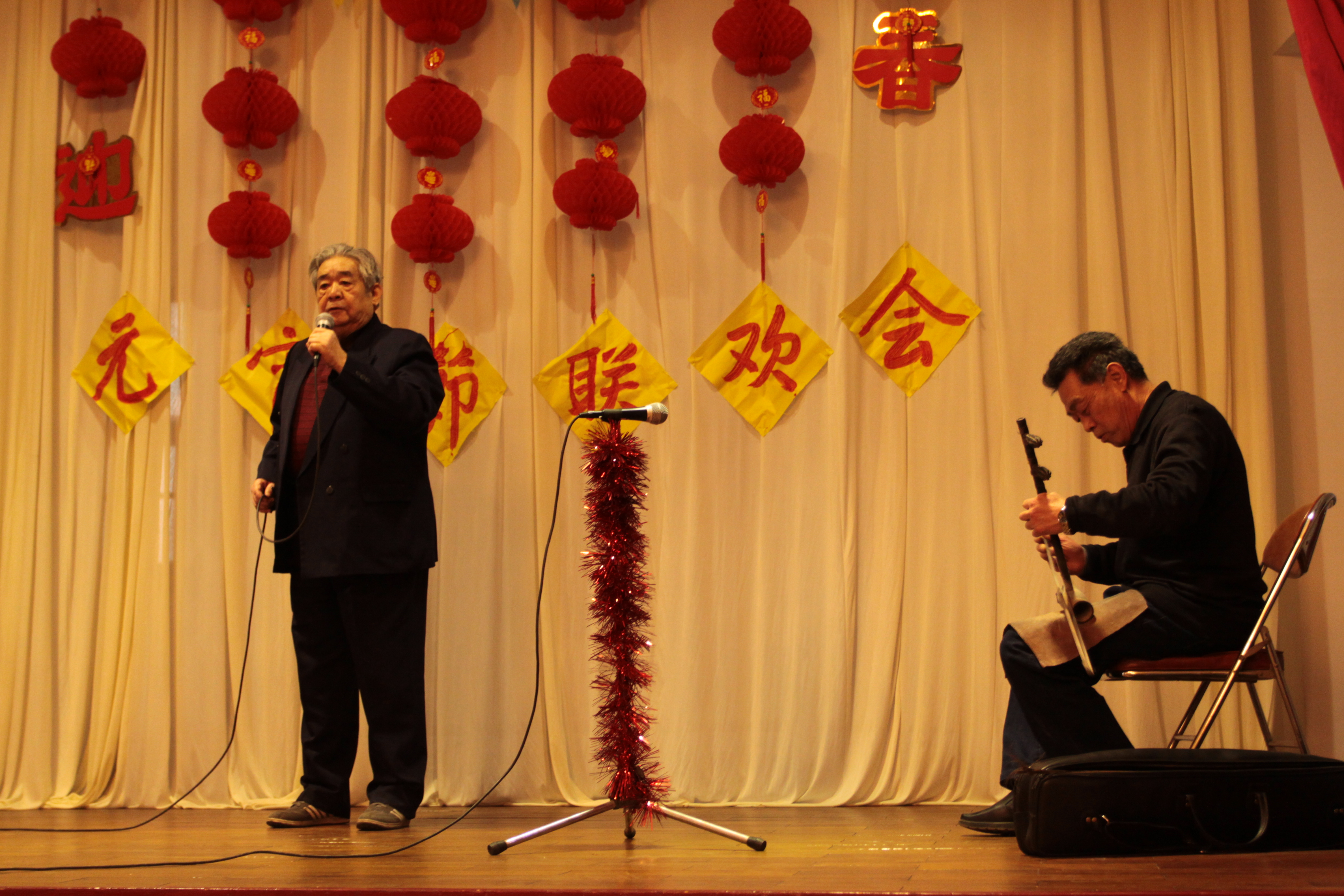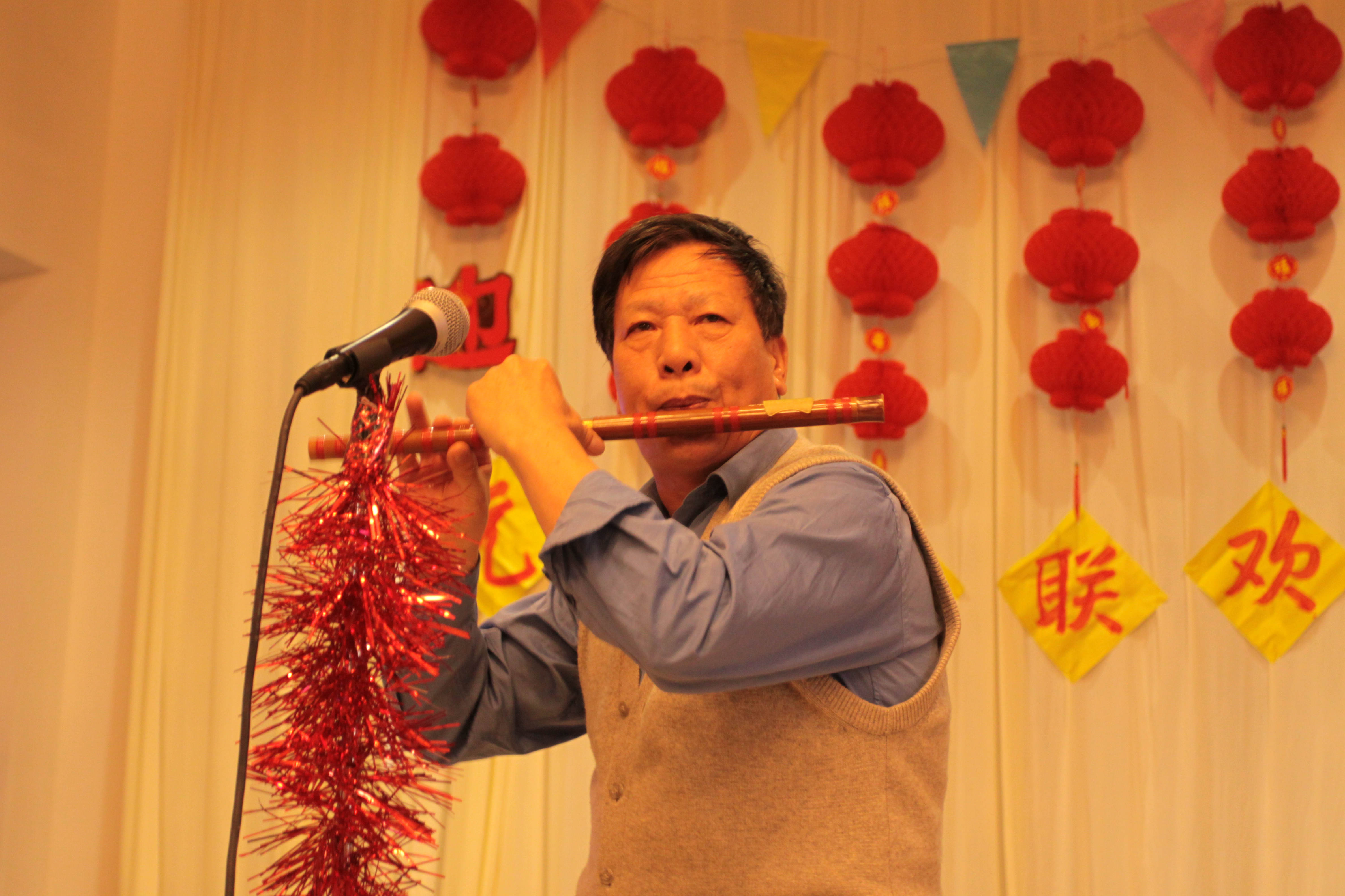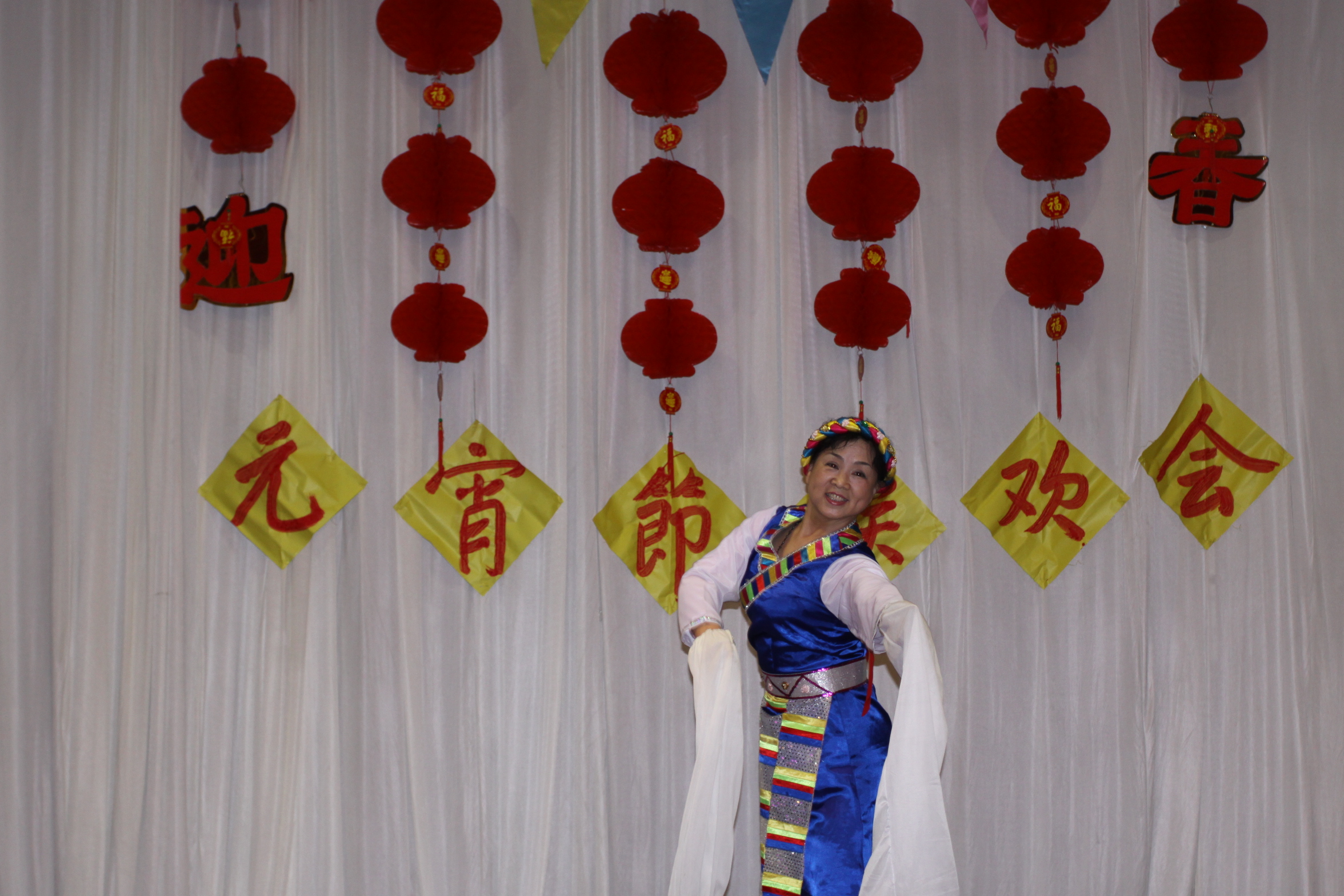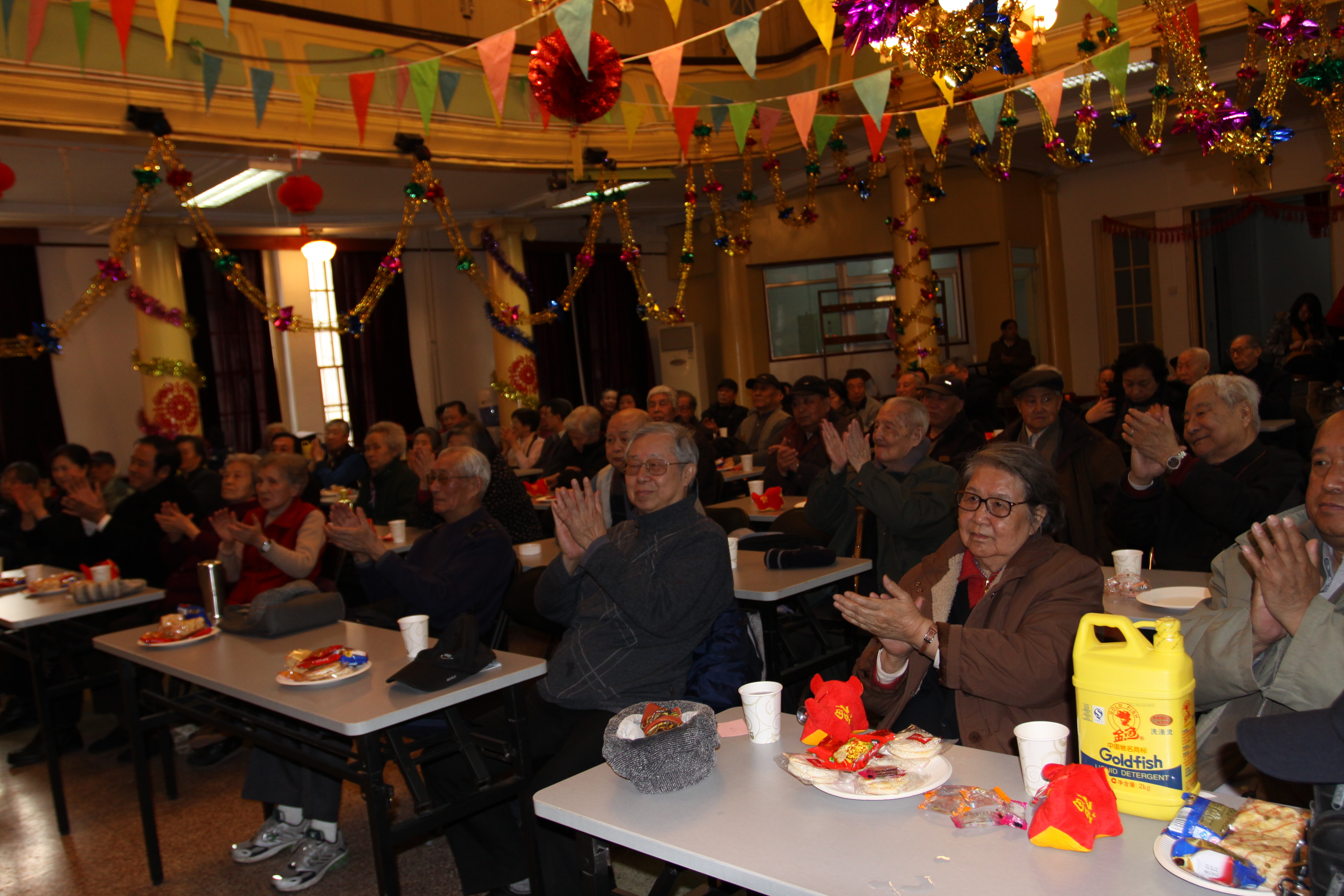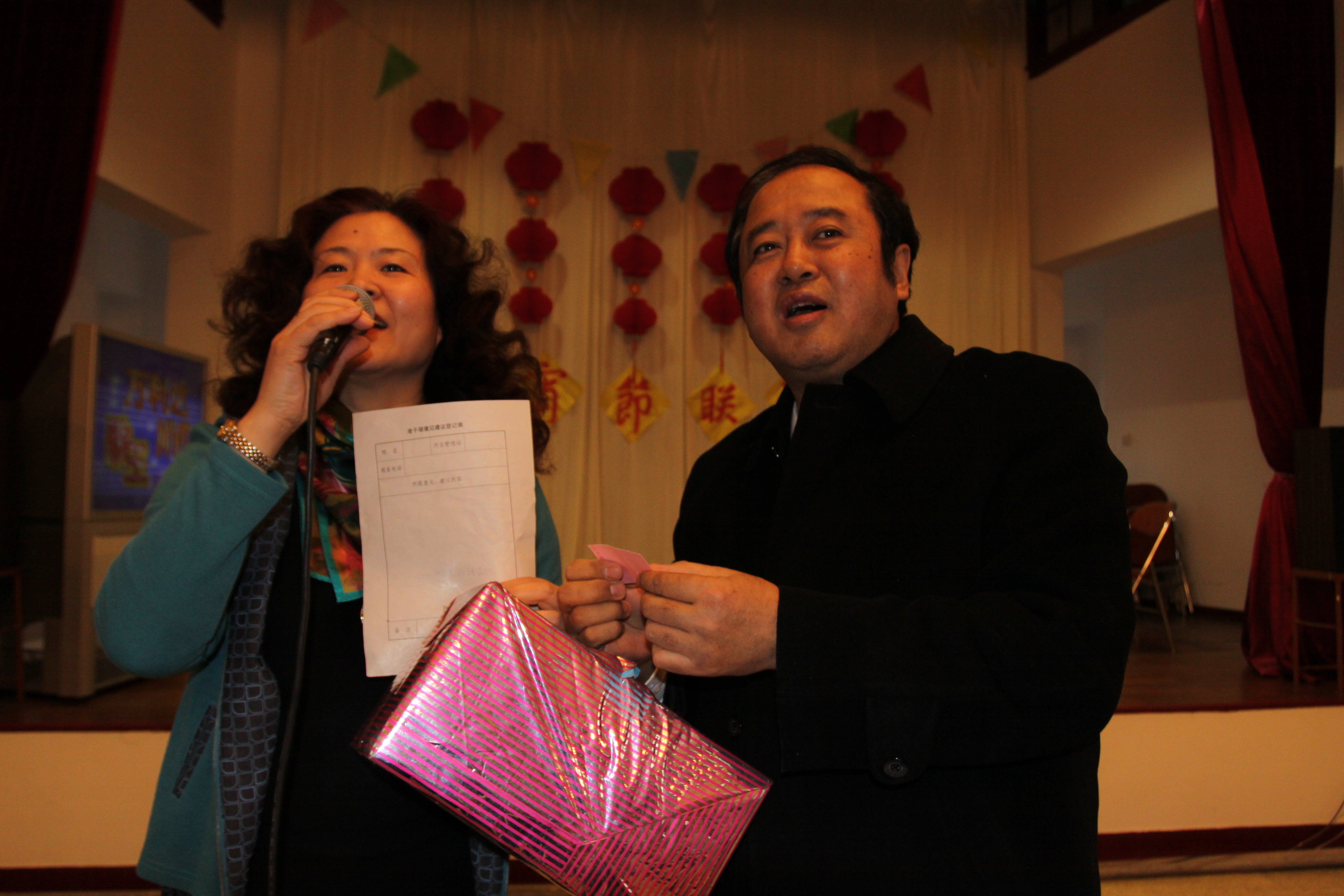 离退休干部局局长张理萌同志(右一)为老同志抽奖。