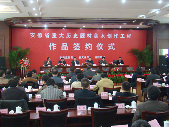2月29日,安徽省重大历史题材美术创作工程第一批作品签约仪式在肥隆重举行。首批入选美术创作工程的作者共73人,担任44个重大历史题材、46幅巨幅作品的创作。这些作品将于今年8月底完成,经终审合格后由政府购藏,交新建的安徽美术馆或省博物院展览。