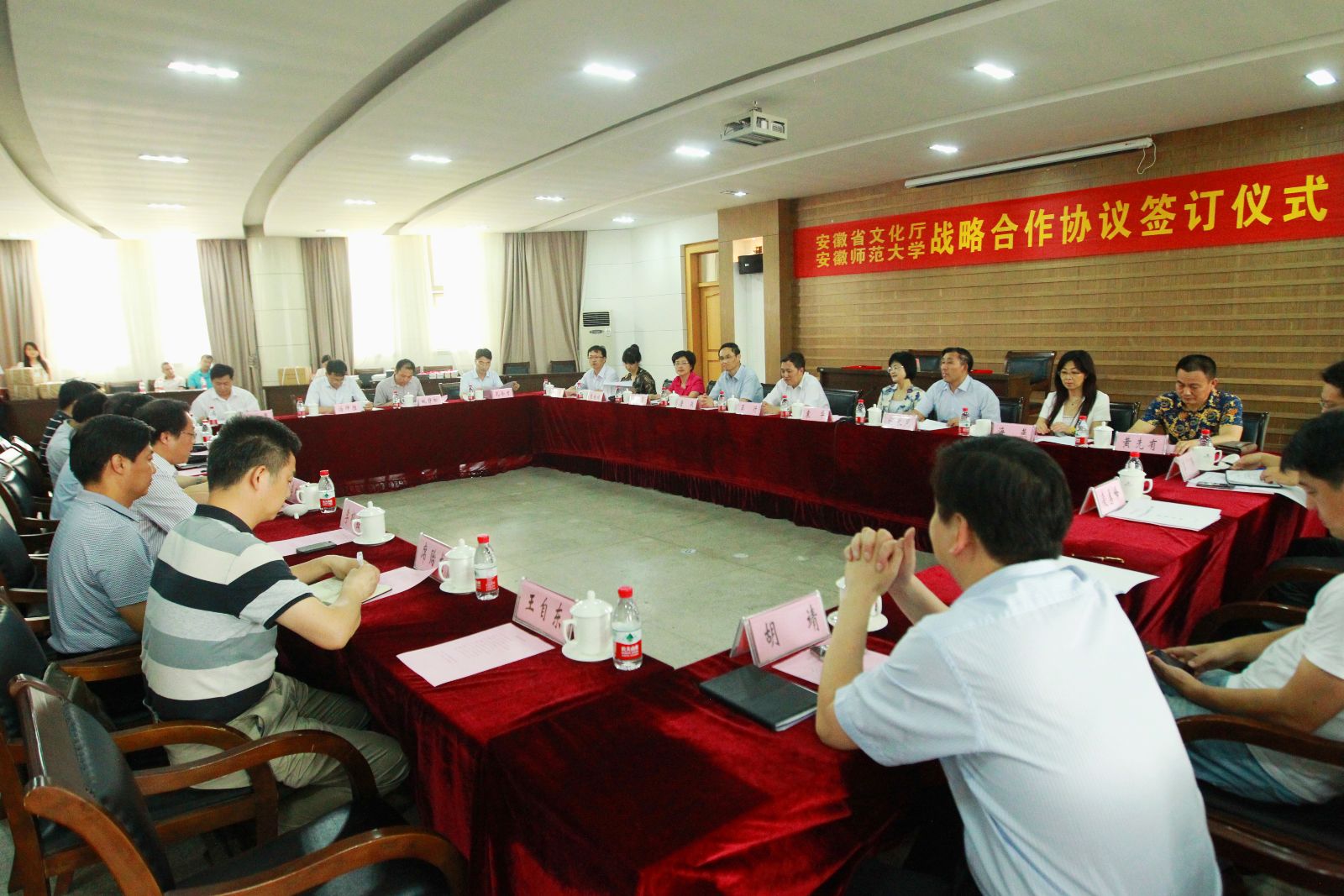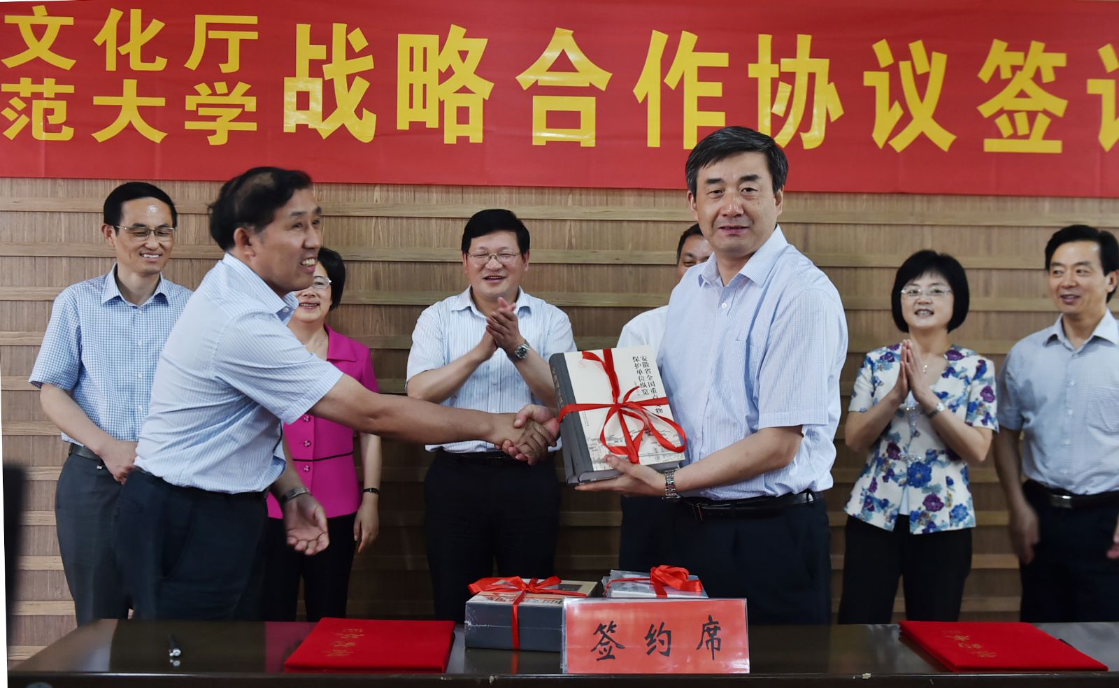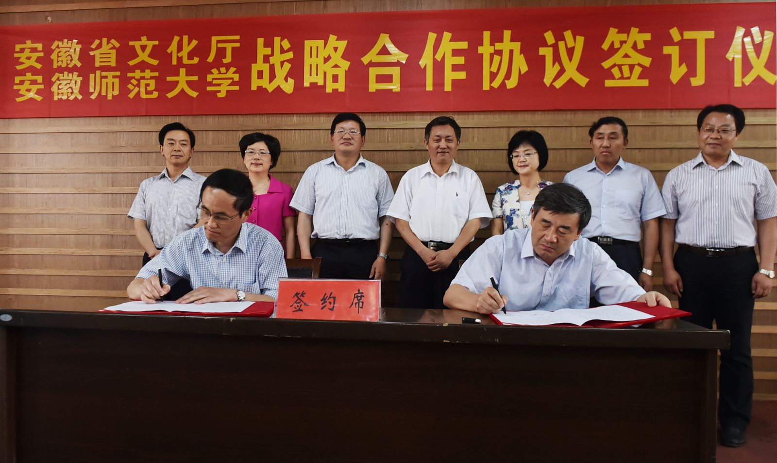 6月12日,安徽省文化厅与安徽师范大学战略合作协议签订仪式在安徽师范大学举行。安徽省政府副秘书长吴行,省文化厅党组书记、厅长袁华、文化厅党组成员、省文物局局长何长风,安徽师范大学党委书记顾家山、党委常委、办公室主任李忠,芜湖市委常委、宣传部长段玉嘉以及厅校相关处室负责人出席仪式。袁华和顾家山分别致辞;安徽省文化厅党组成员、副厅长唐跃,安徽师大党委常委、副校长王绍武分别代表厅校在合作协议上签字;安徽师大党委副书记李琳琦主持仪式。