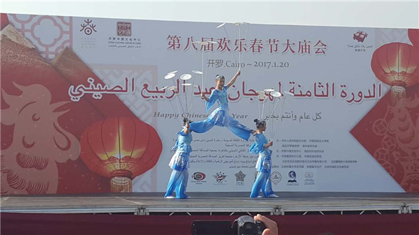 1月18日至22日,临泉杂技亮相中国驻埃及大使馆华侨华人春节招待会和中国驻埃及大使馆与埃及旅游部、文化部联合主办,开罗中国文化中心承办的第八届“欢乐春节大庙会”演出活动。旅埃华侨华人、中资机构人员、汉语教师和留学生及使馆工作人员500余人欢聚一堂,共度佳节。精彩纷呈的口技、手技、蹬技、变脸以及欢乐小丑等受到了观众的喜爱。“欢乐春节大庙会”活动拉开了省文化厅与开罗中国文化中心2017为期一年的部省对口合作文化交流活动大幕。中国驻埃及大使宋爱国夫妇、埃旅游部长代表纳赛尔、外国驻埃使节等各界嘉宾共同出席活动,埃中民众逾万人前来观赏。中央电视台、人民日报、光明日报、新华社以及埃及国家电视台、尼罗河电视台等中外媒体对活动进行了全方位报道。