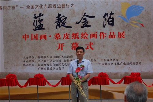 6月9日,由新疆维吾尔自治区人民政府主办,文化部社会文化司、新疆维吾尔自治区文化厅、广东省文化厅承办,新疆维吾尔自治区文化馆、广东省文化馆、广州市越秀区文化广电新闻出版局、广州市越秀区文化馆协办的2012年“春雨工程”全国文化志愿者边疆行之蓝靛金箔·桑皮纸绘画作品展览在广州市越秀区文化艺术中心展出。
