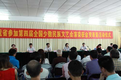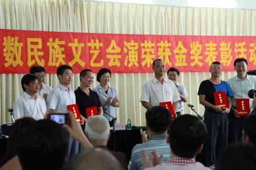 8月7日下午,广东省参加第四届全国少数民族文艺会演荣获节目金奖表彰活动在南方歌舞团举行。广东省人民政府副省长雷于蓝,广东省委统战部副部长、省民族宗教事务委员会主任陈小山,广东省文化厅厅长方健宏,广东省民族宗教事务委员会副主任李秀英,广东省民族宗教事务委员会副巡视员陈世杰,广东省文化厅副厅长杨树等出席表彰会并为获奖单位代表颁奖,省民族宗教事务委员会、省文化厅和南方歌舞团、连南、连山、乳源3个自治县歌舞团的有关领导及演职人员参加了表彰会。