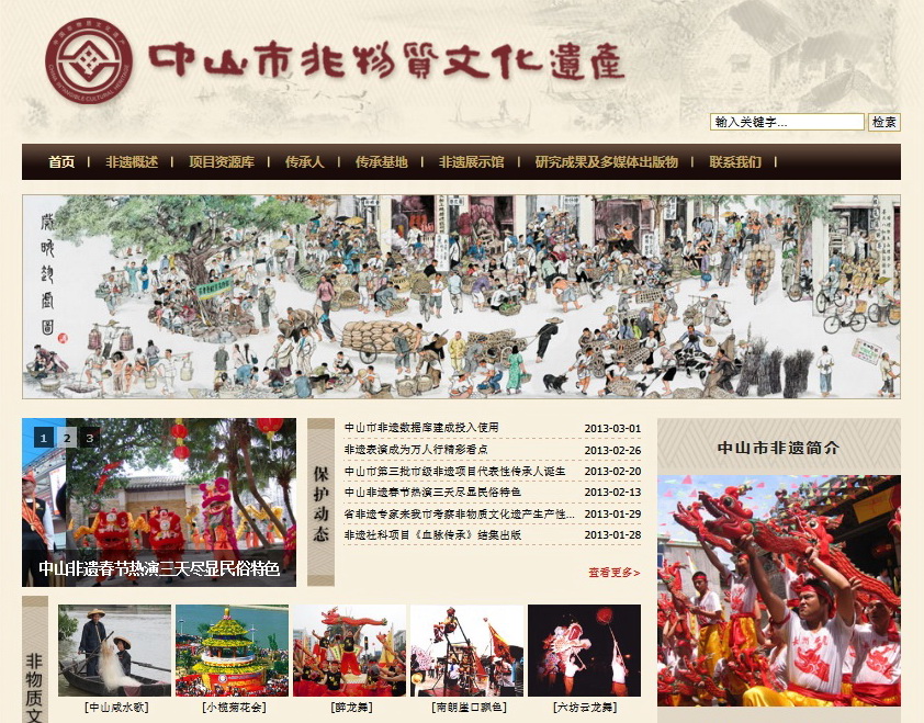 中山市从2005年开展非物质文化遗产的普查和申报工作,迄今为止,共普查到300多条有历史和文化价值的非物质文化遗产线索项目,有6个项目成功申报为国家级非遗名录,有数十个项目入选省级或市级名录,并有30名传承人成功申报为国家级或省市级非遗代表性传承人。中山市近年在非遗保护主要做了如下工作: