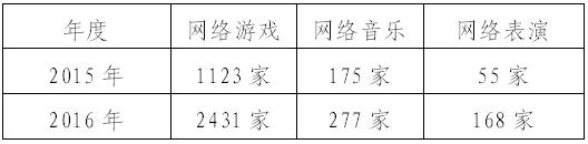 2016年,广东网络文化行业新增企业数量激增,网络文化经营单位呈井喷态势,新审批设立经营性互联网文化单位1573家,同比增幅高达233%。全省《网络文化经营许可证》持证企业存量达到2663家,首次超越北京市,位列全国第一。全省经营性互联网文化单位中,涉及网络游戏运营、网络游戏虚拟货币发行及交易业务的企业有2433家,占总量的91.8%,比2015年增加1310家,增幅高达116.7%。涉及网络音乐业务为277家,占总量的10.4%,比2015年增加102家,增幅为58.3%,涉及网络表演业务的为168家,占总量的6.6%,比2015年增加113家,同比增长205.5%。从业务范围来看,网络游戏企业仍然占绝对多数,且增长势头依然强劲,网络音乐企业数量增长平稳,而网络表演企业开始迅猛增长。