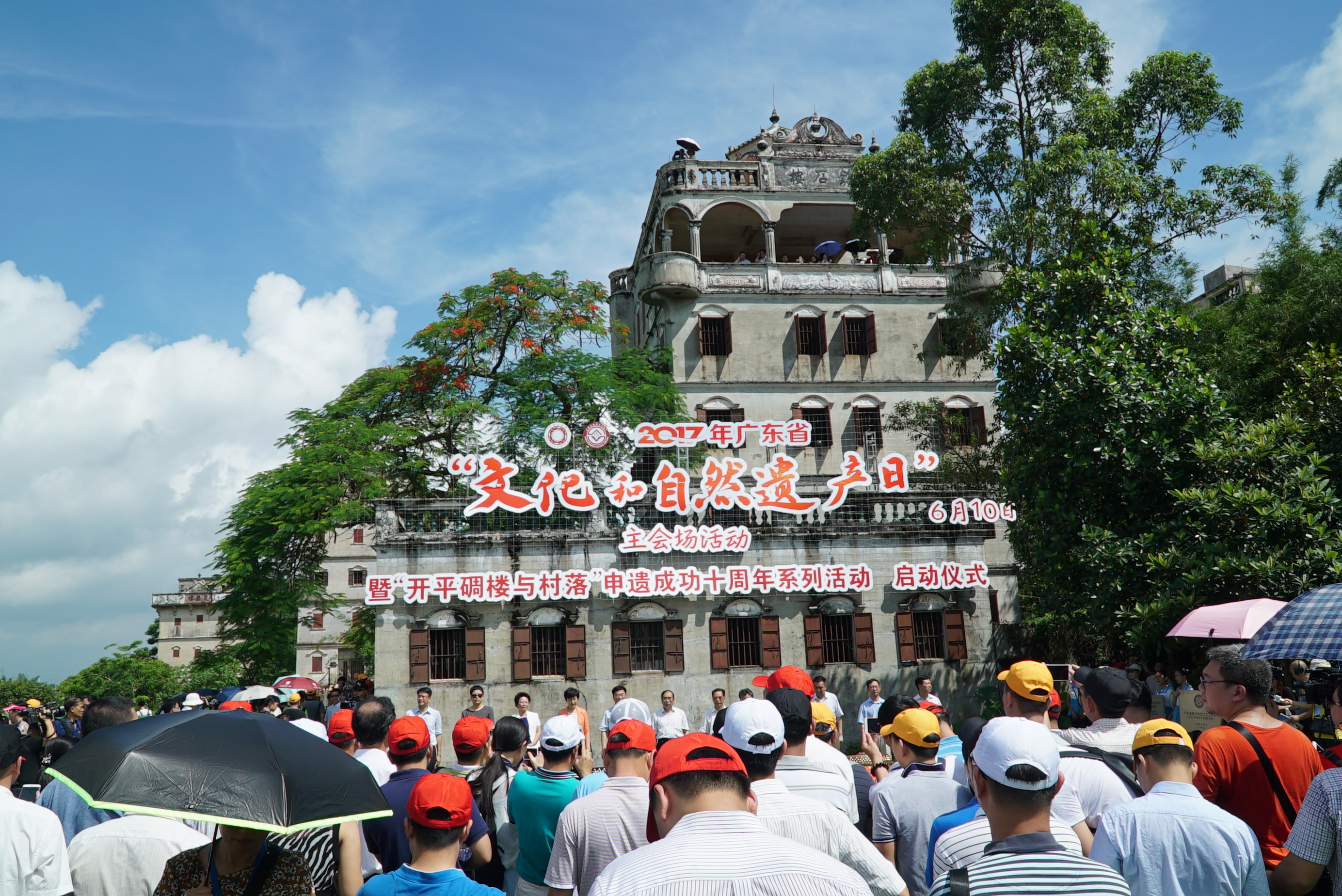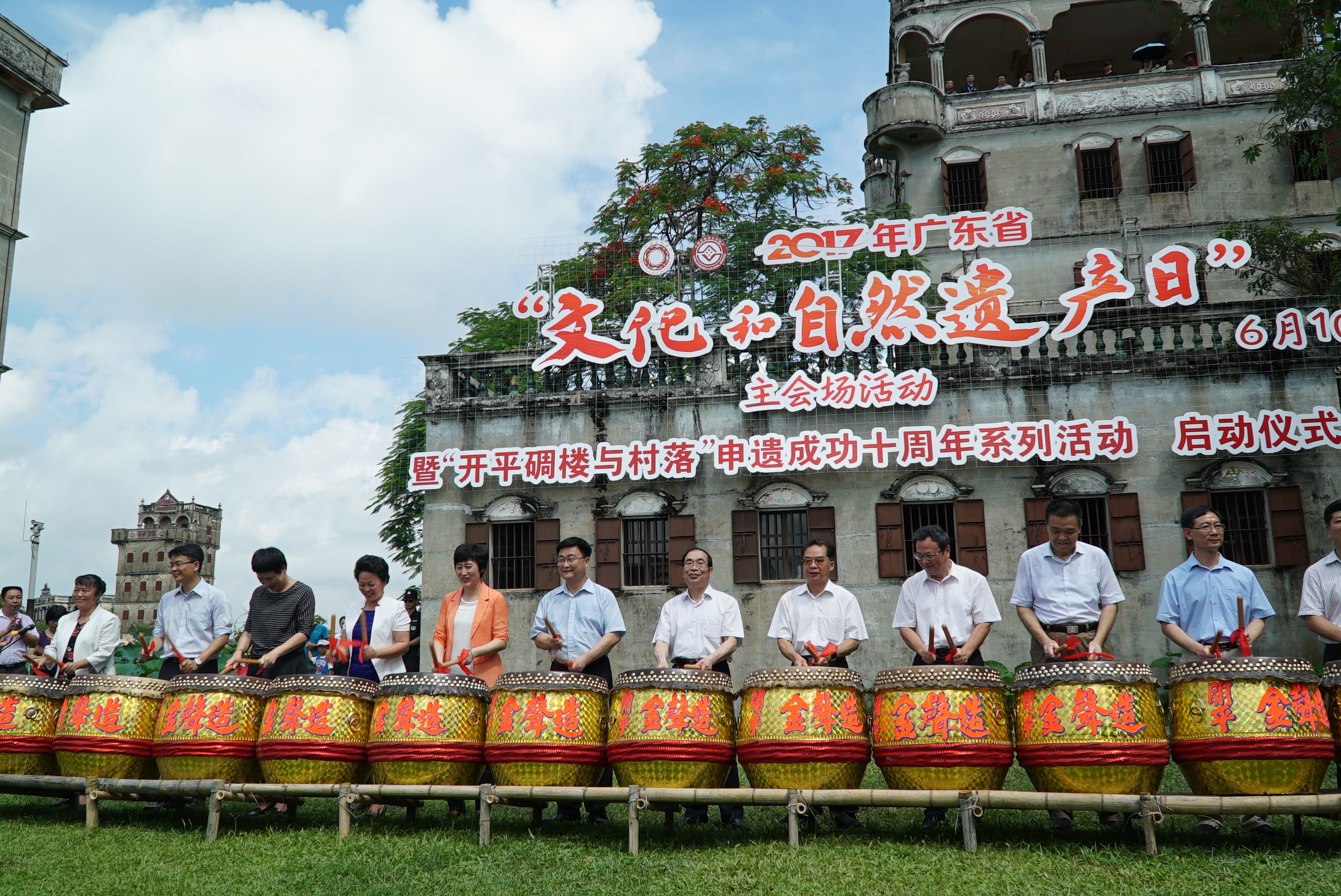 6月10日上午,广东省“文化和自然遗产日”主会场系列活动启动仪式在江门开平市自力村碉楼景区举行。省人大常委会副主任周天鸿和省直相关单位、江门市有关领导共同出席了启动仪式。启动仪式由省文化厅副厅长陈杭主持,省文化厅厅长方健宏和江门市市长刘毅分别致辞,有关领导为侨乡文化(江门)生态保护实验区、第三批省级非物质文化遗产传承基地、广东省传统工艺工作站分别颁发了牌匾,并通过齐敲金声狮鼓的方式宣布系列活动正式启动。