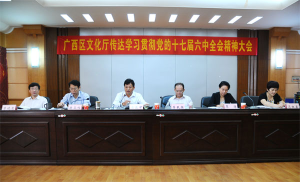 10月24日上午,广西文化厅党组书记、厅长余益中召集厅党组成员和厅领导班子同志率先开展了学习十七届六中全会精神和自治区党委领导关于学习贯彻十七届六中全会讲话要求。紧接着,余益中主持召开了厅机关理论学习中心组和直属单位领导班子会议,广泛传达学习贯彻全会精神。会上,他结合广西壮族自治区党委常委扩大会议的学习讨论精神和刘云山部长的讲话精神,向与会的同志们传达了中共十七届六中全会的精神,指出全会总结了我党领导下文化取得的重大成就和经验;进一步明确了文化在整个国家发展大局中的地位和作用;进一步明确了文化发展繁荣的指导思想;提出了建设社会主义文化强国的奋斗目标;并对推进文化改革发展做出了全面部署,其中重点从七个方面阐述了推进文化体制改革发展的部署内容。他强调,中共十七届六中全会对于中国特色社会主义文化事业来说具有里程碑式的意义,标志着文化建设进入了一个新的发展阶段,广西文化系统要按照“全员覆盖、先学一步、学深学透、融会贯通、应用实践”的要求,做到领导带头、党支部带头,扎实抓好学习,深刻领会全会的重大意义和精神实质,形成推动广西文化改革发展的强大动力。会议最后,他对下一步全区文化工作提出了三点要求,要求全区文化系统主动开展对全会中重大问题的研究,落实好今年的工作任务,着眼于明年和更长一段时间的工作,提前布局、积极行动、努力工作,为广西经济发展作出更大贡献,不辜负党和人民对文化工作者的期望。