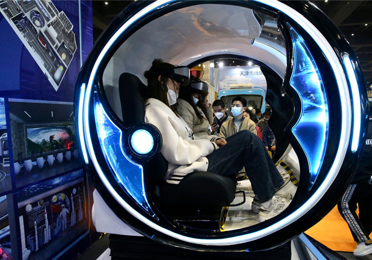 3月26日,2023中国(郑州)旅游休闲娱乐产业博览会在郑州国际会展中心举行。该展会涉及文旅项目策划规划、数字科技体验、游乐设施设备、创意景观及场景营造、景点配套产品等五大核心展区。当日,观众在现场体验游乐设施等设备。