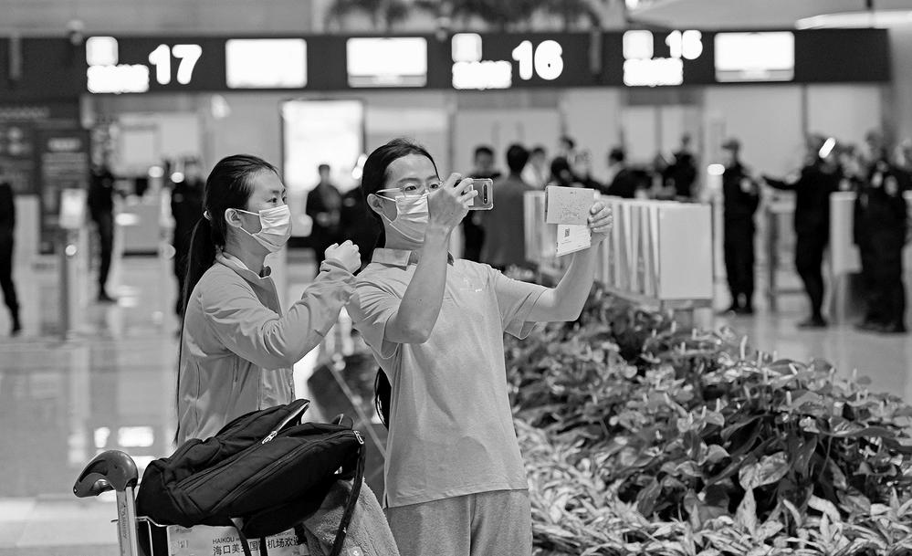 12月2日,海口美兰国际机场二期扩建项目正式投入运营。该机场二期扩建项目是海南省重点工程项目,是海南自由贸易港发展旅游业、空港物流产业的基石。图为当日,游客在海口美兰国际机场T2航站楼,手持登机牌拍照留念。(杨冠宇 摄)