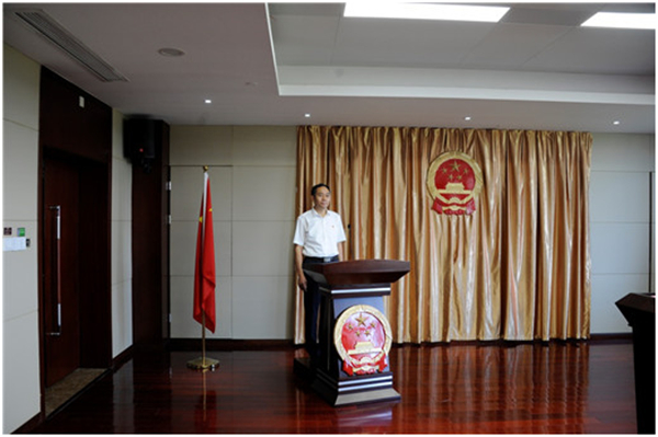 宣誓现场,全体起立,奏唱中华人民共和国国歌。48名处级领导干部,列队面向国旗国徽肃立。领誓人左手抚按《中华人民共和国宪法》,右手举拳,领诵誓词。宣誓人右手举拳,跟诵誓词。宣誓字字铿锵有力、掷地有声,整个宣誓过程庄重严肃。