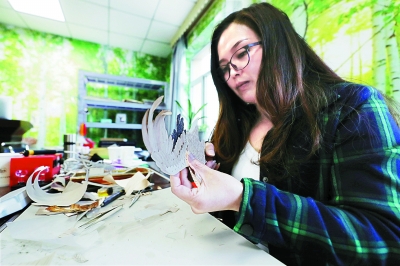 非遗传承人李艳红正在工作室内制作树皮画
