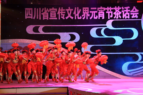 茶话会上举行了精彩的文艺演出。民乐《红梅迎春》以欢快、愉悦的乐曲将茶话会带到更加喜庆、热烈的气氛中。有七岁小演员参加表演的京剧、黄梅戏和川剧联唱,以细腻的表演与优美的唱腔,展示出艺坛新秀的功力。曾参加过今年中央电视台春节联欢晚会的广元文化馆老妈妈艺术团,为大家带来了女子群舞《老妈妈》,以丰富优美的舞台语言,表现出地震灾区人民群众过上幸福美好生活后的喜悦和社会主义新农村妇女乐观豁达、积极向上的精神风貌。当《天籁之爱》浪漫而热烈的旋律响起时,会场中许多代表合着音乐节奏,跟着藏羌民族声乐组合歌手轻轻地哼唱起来,大家用歌声赞美世间美好的事物,赞美民族团结和睦。在深情的诗歌朗诵中,四川省老中青三代著名书画家现场作画,很快将一幅《水墨四川》展现在与会嘉宾面前,作品浑厚大气又不失淡远意境,美好四川、和谐四川跃然纸上。双簧《说说咱家事》和歌舞《元宵咪咪甜》、《百花迎春》等节目也精彩纷呈。整台演出通过民乐、舞蹈、戏剧、书法、绘画、朗诵等舞台艺术形式,展现出四川文化艺术大繁荣、大发展的春天景象,表达了全省宣传文化工作者自觉肩负使命,勇于担当建设文化强省重要使命的精神风貌和信心决心。