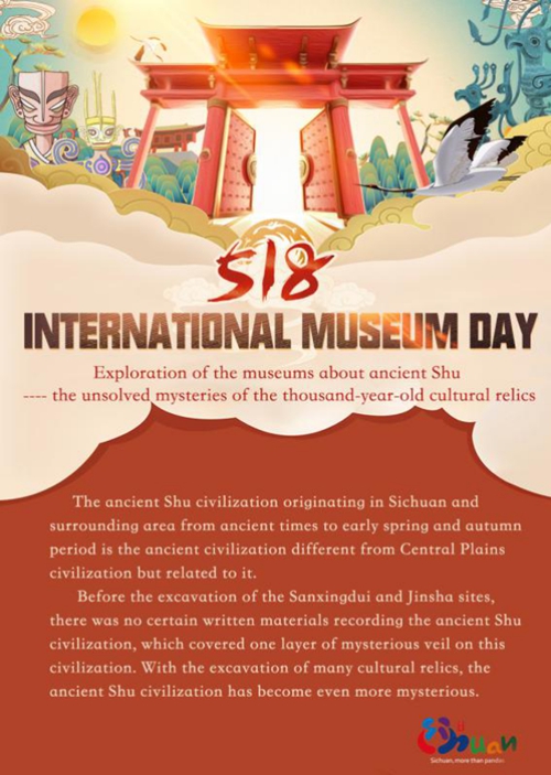 2020年5月18日,四川省文化和旅游厅联合6家海外中国文化中心,以“探秘古蜀博物馆——千年文物的未解之谜”为主题,举办“5·18国际博物馆日”古蜀文物海外线上展览,向国内外网友集中介绍了神秘的古蜀文物,引起广泛关注。