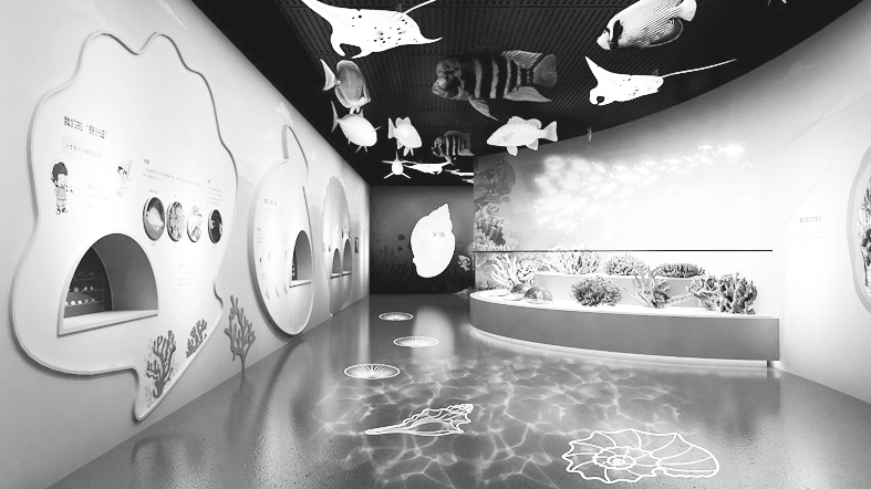记者了解到,为了让观众足不出户,即可体验“赶海”的乐趣,本次展览还运用到声、光、电等多媒体手段和互动体验,让观众沉浸其中。展览现场,珊瑚礁下的鱼群共舞、富含童趣的光影色调、海浪逐沙滩、波光粼粼等感官性氛围设置,让人们宛如置身海边。观众不仅可以用海螺倾听大海的声音,还能亲手触摸部分贝类实物,通过翻牌、拼图等物理互动小游戏,识别、还原贝类种类与形状。值得一提的是,从史前时代开始,就与人类生活结下不解之缘的贝类,还将化身贝币、贝雕、螺钿艺术品、生活用品等不同形式出现在展厅中,让观众顺着时间的长河,感受贝类在人类生活中的多彩印记。
