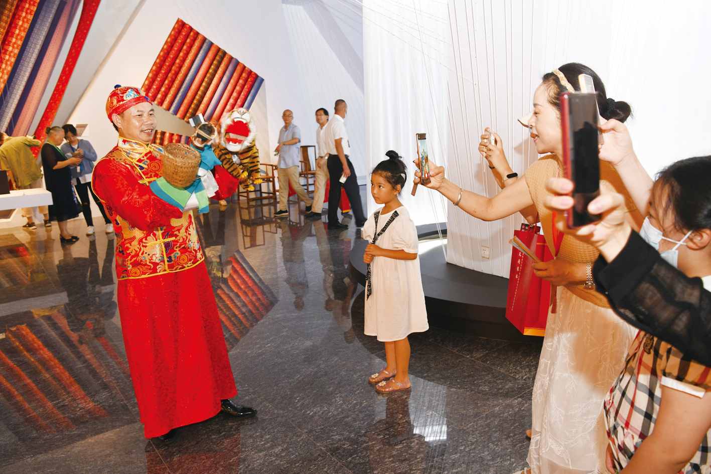 进入展馆内,只见色彩变化多样,布局错落有致,展陈内容与传统艺术完美融合,非遗传承人的活态展示更是深深地感染了现场观众,使人不自觉地融入其中。