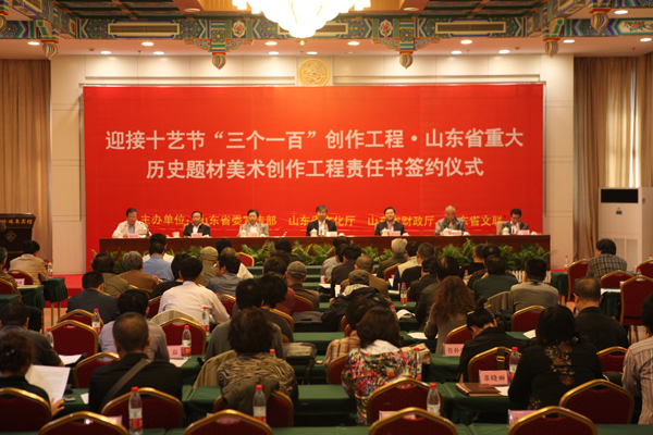 25日,由中共山东省委宣传部、山东省文化厅、山东省文联、山东省财政厅联合主办的迎接十艺节“三个一百”创作工程﹒山东省重大历史题材美术创作工程委托创作责任书签约仪式在济南举行。山东省委宣传部副部长、省文化厅党组书记徐向红,省委宣传部副部长刘为民,省文联党组书记于钦彦等领导出席了签约仪式。杨松林,张志民等著名艺术家参加了签约仪式。