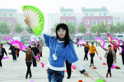 10月15日,在山东省东营市垦利县的民丰社区,县文化馆辅导员正在带领庄户剧团排练舞蹈。