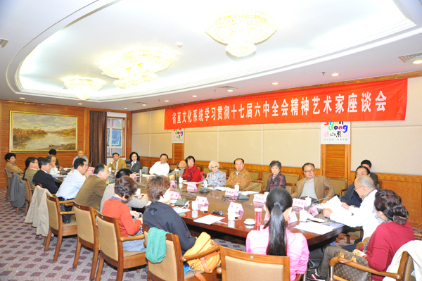 为宣传贯彻党的十七届六中全会精神,发挥知名艺术家带动作用,在山东省广大文艺工作者中形成齐心协力共同推进山东文化大发展大繁荣的良好氛围,10月19日,山东省文化厅邀请省内部分知名艺术家,召开“省直文化系统学习贯彻十七届六中全会精神艺术家座谈会”。参加座谈会的人员包括山东老中青三代艺术家,既有老一代德艺双馨的知名艺术家,也有挑梁当前齐鲁舞台的中青年艺术骨干,还包括部分“80后”的青年艺术新秀,基本代表了全省广大文化工作者的不同层面。座谈会上,三代艺术家畅谈了学习十七届六中全会精神的感受、体会。大家在发言中普遍认为,十七届六中全会的胜利召开,是广大文化工作者期盼已久的盛事,党中央、国务院首次提出了“文化强国”的目标,从战略高度上对全面推进社会主义文化大发展大繁荣做出部署,使广大文化工作者明确了方向,清晰了目标。吕剧表演艺术家郎咸芬说:“中央首次将文化命题做为中央全会的议题,说明对文化的高度重视和关注。我作为一个老文艺工作者,要加倍努力,把青年演员培养成才,为山东文艺的发展繁荣,做出自己的贡献。”山东著名地方戏作曲家高鼎铸说:“文化事业,党和政府一直十分重视,但第一次在中央会议上作为专题讨论。作为文化工作者,一是感到自豪,二是感到责任重大。他认为深化文化体制改革是一个手段,目的是使文化大发展大繁荣。”柳子剧团90后年轻演员尹春媛表示听到众位前辈的发言,感觉受益匪浅,今后工作中一定更见努力学习技艺,争取创作出更多精品力作奉献给广大观众。”