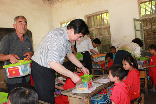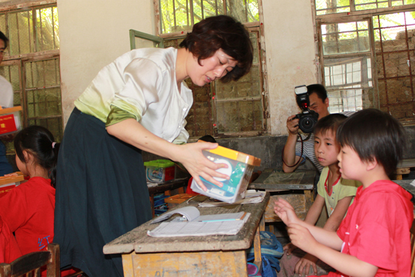 山东省文化厅“第一书记”工作团副团长、副厅长李国琳为孩子们发放绘画箱