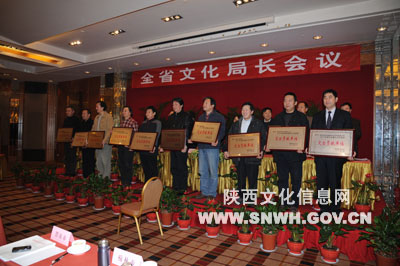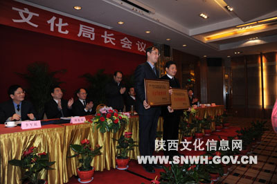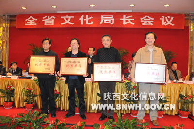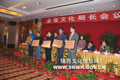 会议由陕西省文化厅副厅长蒋惠莉主持。郑小明、孟建国、余华青等领导为获奖单位颁发了奖牌。余华青传达了全国文化厅局长会议精神,并作工作报告,全面回顾总结了2011年文化工作,对2012年全省文化工作进行了安排部署。