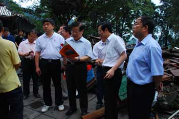 文化部部长蔡武、国家文物局局长单霁翔等考察都江堰二王庙受损情况。林 雪 摄