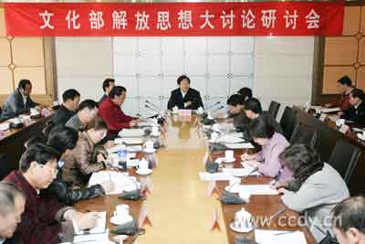 聆听了部领导的学习辅导后,文化部机关各司局、各直属单位的司局级领导争相发言,结合文艺创作、公共文化服务体系建设、文化产业发展、文化市场管理、对外文化交流、文化遗产保护等方面的工作实际,对解放思想进行了深入讨论。有的观点引起了强烈共鸣,有的观点则引发了激烈辩论,研讨会现场气氛十分活跃。中央学习实践活动指导检查组有关负责同志参加了研讨会。