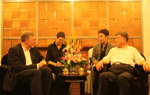 7月12日下午,代表团一行拜访文化部并与中方就2012-2015年中奥文化交流执行计划文本内容进行磋商。当晚,李洪峰部长特别助理在亚洲大酒店会见并宴请艾希廷格一行。李洪峰首先对代表团一行访华表示欢迎,并愉快地回顾了今年5月率团访奥时所受到的热情招待,就此向奥方表示感谢并预祝代表团此行访华取得圆满成功。