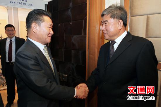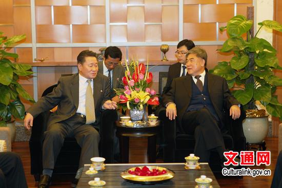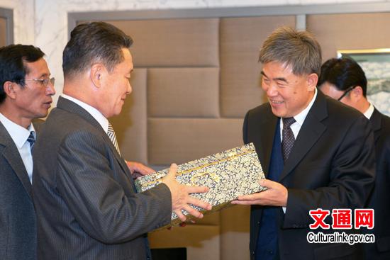 11月9日,文化部副部长李洪峰在京会见了朝鲜劳动党中央宣传部副部长权赫峰及朝鲜歌剧《梁祝》剧组主要演职人员,朝鲜驻华大使池在龙陪同会见。