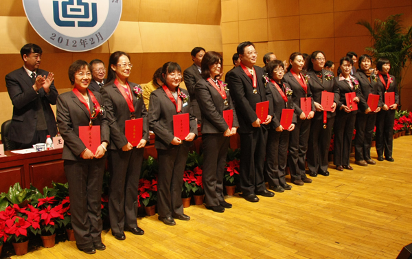 会上宣读了国家图书馆关于表彰2011年度“先进集体”、“服务标兵”、“创新奖项目”和“馆长特别奖”的各项决定,以及国家图书馆在馆工作满三十年员工名单。在欢快的乐曲和热烈的掌声中,主席台就座的领导依次向获奖的集体代表和个人颁发了荣誉证书,向在馆工作满三十年的23名员工颁发了纪念章和证书。