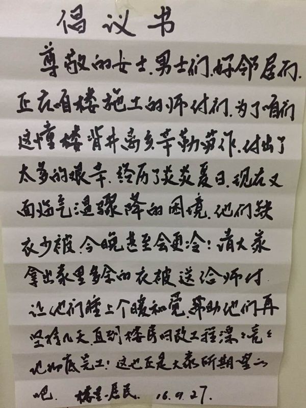 近期京城气温骤降,9月27日,华威北里15号楼电梯间贴出的一份匿名倡议书引起了我们的注意。倡议书既是对全体参建人员辛勤付出的慰藉,也为大家再接再厉全面完成老旧小区综合整治任务提供了动力。下一步,我们将继续贯彻落实中央和部党组关于老旧小区综合整治有关指示精神,全力推进各项目实现预期进展。