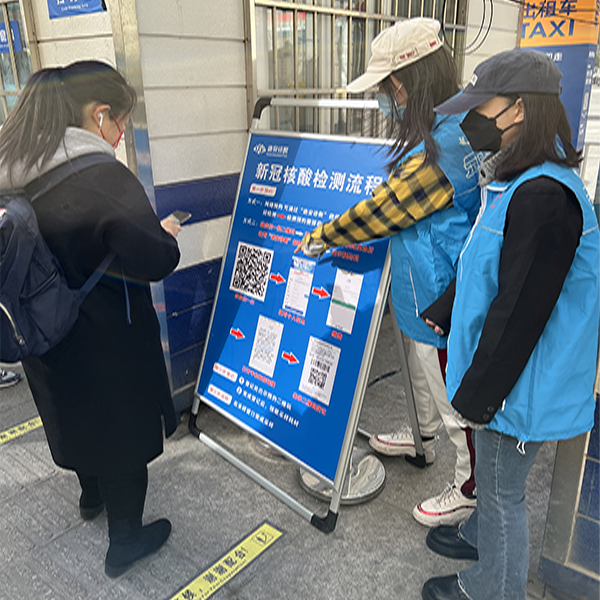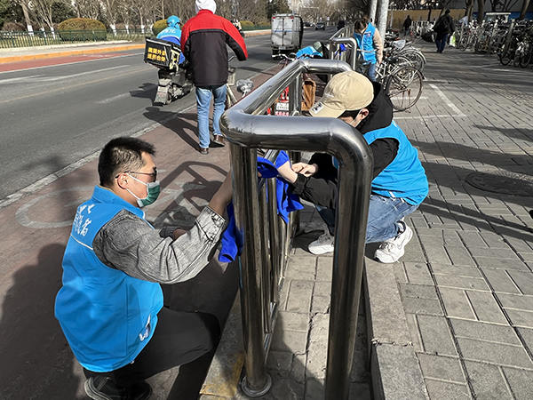 早春三月,春寒料峭,活动一早大风呼啸,但志愿者们“奉献、友爱、互助、进步”的志愿精神并没有受到影响,早上9点半,大家带着自备的劳动工具准时到达了东直门交通枢纽广场。在与街道工作者沟通交流后,志愿者们明确了活动任务,积极开启了志愿服务活动:有的志愿者拿起笤帚,打扫街边墙角的垃圾,劝阻过往群众随手乱丢垃圾等不文明行为;有的志愿者拿着抹布,认真清洁栏杆扶手并进行全面消毒,助力疫情防控;有的志愿者利用专业知识,耐心地为有需求的路人提供血压测量、医疗咨询等服务;有的志愿者在核酸检测点介绍登记方法、维持采样秩序,有效提高了检测效率,防止了人员聚集;还有的志愿者通过发放传单的方式,宣传垃圾分类、疫情防控等知识……志愿者的热情和服务,感染和影响着过往路人,得到了大家的赞赏。