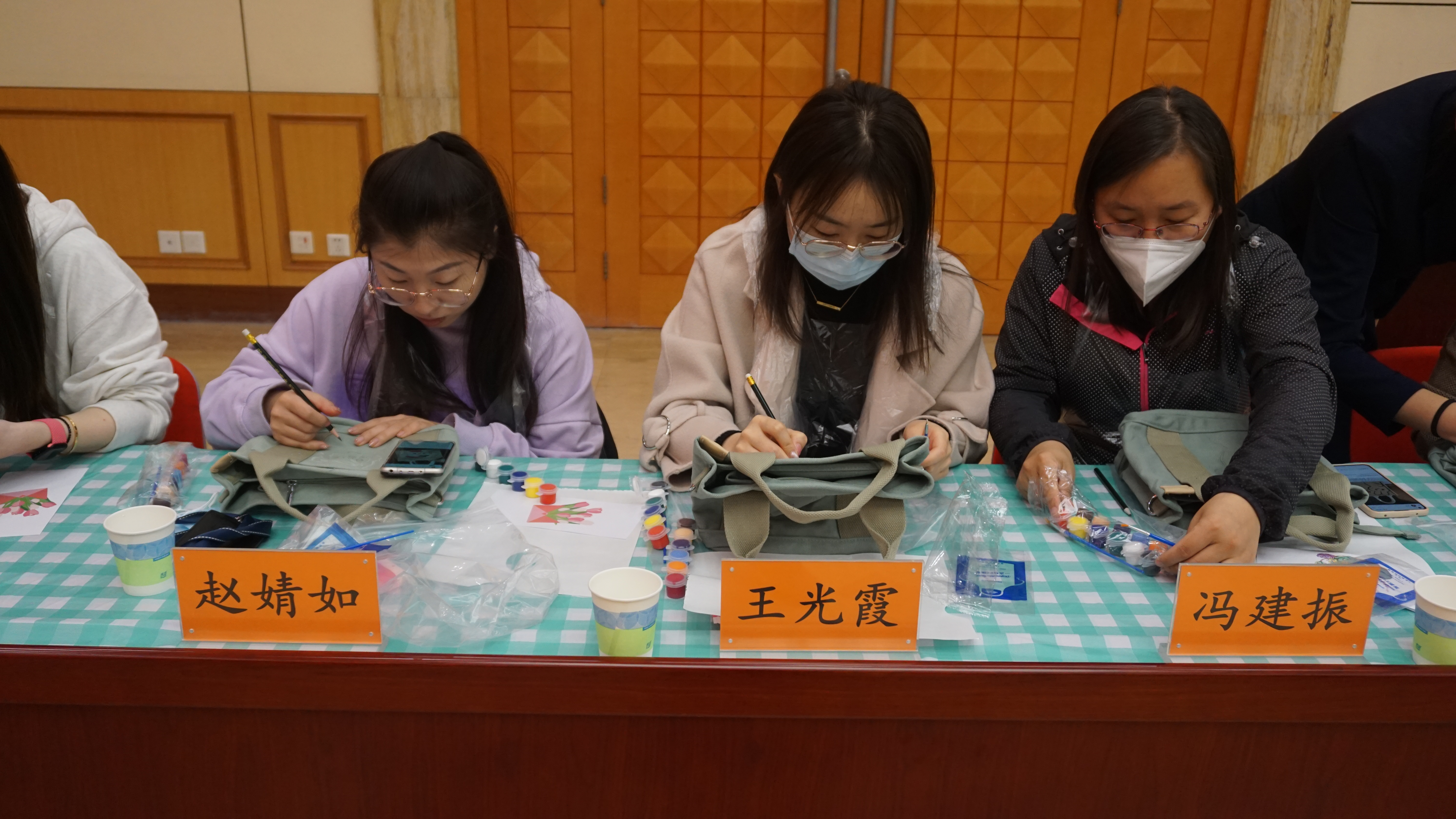 活动现场布置温馨浪漫、气氛轻松愉悦。在DIY手工制作活动环节,老师首先详尽的介绍了手绘帆布包的原材料、制作方法、绘画技巧等,并进行现场教学。女职工个个兴致勃勃,领取了空白帆布包,挑选了自己喜欢的图案,在老师的指导下开始动手创造,从绘制、上色到最后的调整,大家专心致志、一丝不苟,经过用心制作,五颜六色的花朵、栩栩如生的水果、惟妙惟肖的卡通人物跃然“包”上,大家精心绘制,妙笔生花,把普普通通的帆布包,巧绘成为了一件件独一无二的作品。大家纷纷举包展示并合影留念,欣喜之情溢于言表。