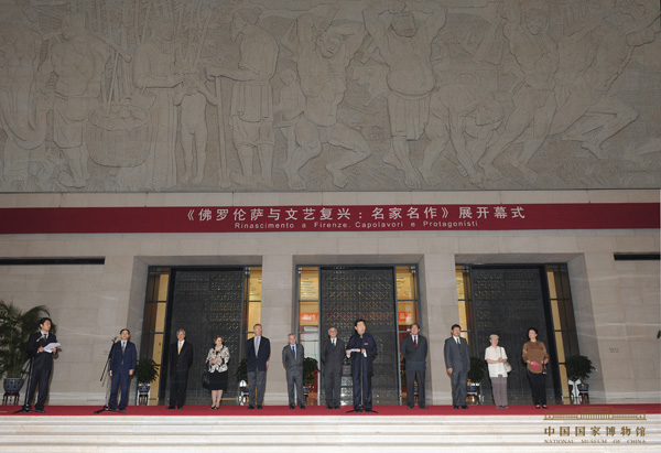 意大利文化遗产与活动部部长洛伦佐才·奥尔纳基,意大利驻华大使严农祺,意大利文化遗产与活动部文物管理与开发司司长马里奥·雷斯卡,意大利佛罗伦萨博物馆署署长、本次展览总策划克里斯蒂·阿齐迪尼,国家博物馆馆长吕章申,国家文物局副局长董保华,文化部对外文化联络局副局长项晓炜,原中央工艺美术学院院长常沙娜,中华世纪坛世界艺术馆馆长王立梅,国家博物馆副馆长陈履生出席开幕式。吕章申、董保华、洛伦佐·奥尔纳基部长、严农祺分别讲话。国家博物馆党委书记、副馆长黄振春主持仪式。