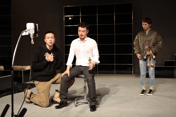 国家话剧院一级演员于洋在剧中饰演导演布鲁克,他创造性地演绎了一个有些“偏执”地沉浸在自己“电影梦”里的暴力片导演形象,在获得奥斯卡荣誉时的慷慨激昂和苦苦哀求杀手放过自己所爱的家人时的绝望孱弱,而营造出的极大反差时,多维度地从表演和语言上加以诠释,可谓精彩。饰演布鲁克妻子的演员牛银红通过肢体和表演,精湛塑造了一个内心多层次,表象浮夸而在极端情境下真实暴露人性的女人形象。邓炀、姜牟远健所饰演的一对劫匪,跋扈与天真并存、善与恶并存、盲目与无知并存,在暴力与血腥中徜徉,虽收到暴力美学教化但终究内心难以掩饰住纯真孩子气,让观众不住思考当下。青年演员顾珂嘉、马昂、王咪佳、王大卫各自诠释出或直率、或叛逆、或心机的人物形象,在被裹挟的这一场杀戮中呈现了人性复杂多面的意义。