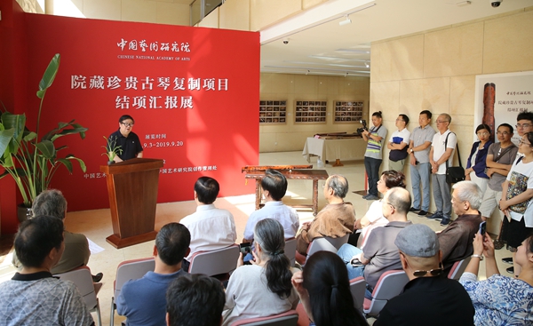 2019年9月3日,由中国艺术研究院研究生院主办的“中国艺术研究院院藏珍贵古琴复制项目结项汇报展”在北京拉开帷幕。开幕式由中国艺术研究院副院长谭平主持,中国艺术研究院党委书记、院长兼中国非物质文化遗产保护中心主任韩子勇发表致辞。全国人大常委会委员、全国人大教科文卫委员会副主任委员杨志今、原文化部副部长王文章出席了开幕式。