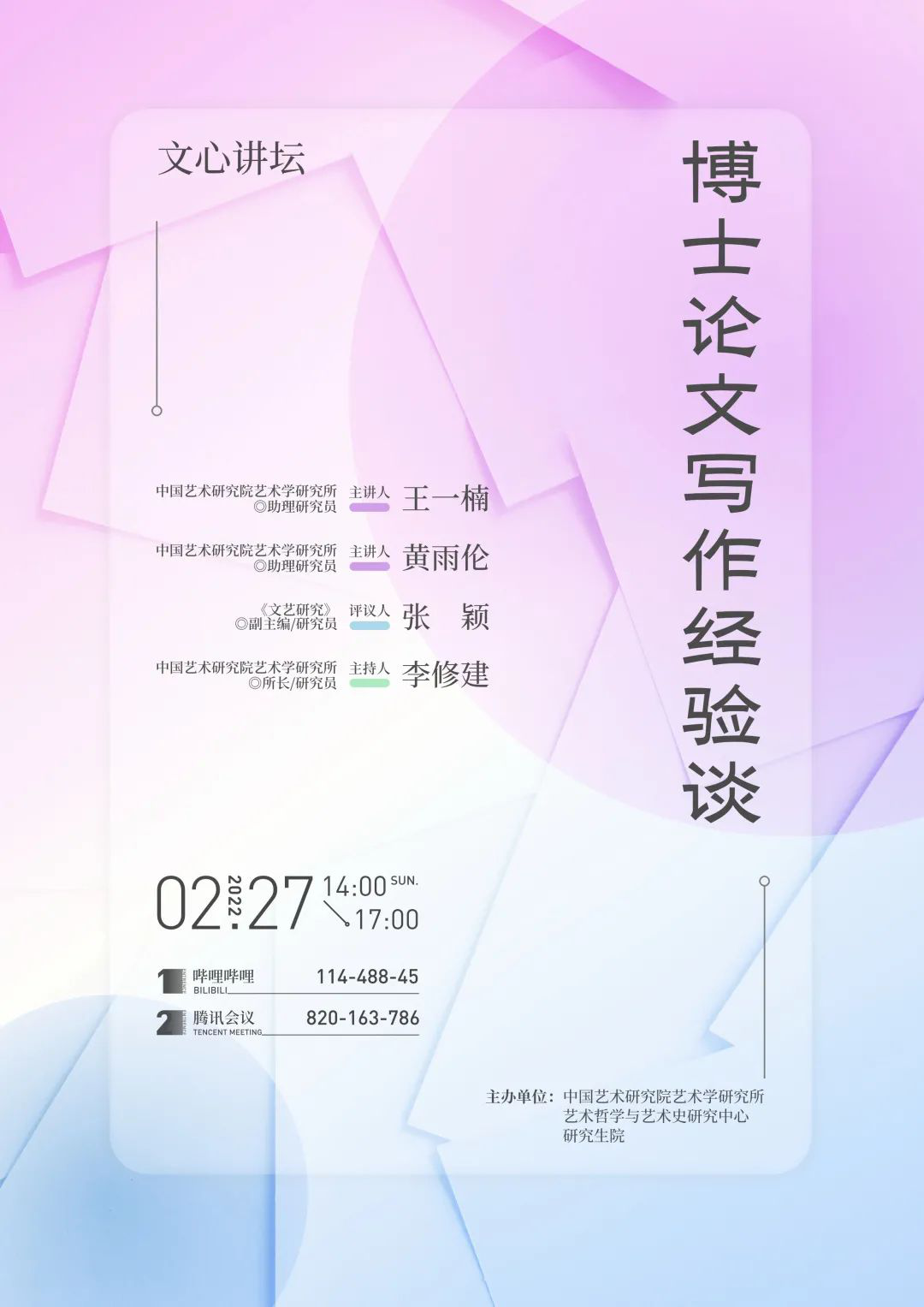 2022年2月27日,中国艺术研究院艺术学研究所、艺术哲学与艺术史研究中心、研究生院共同主办题为“博士论文写作经验谈”线上讲座。本次活动由中国艺术研究院艺术学研究所助理研究员王一楠博士、黄雨伦博士主讲,《文艺研究》副主编、研究员张颖进行评议,中国艺术研究院艺术学研究所所长、研究员李修建主持。本次讲座取得了良好的传播效果,通过线上平台参与的观众逾2万人。中国艺术研究院副院长兼研究生院院长李树峰、研究生院副院长郑光旭、研究生院研究生,以及众多院内外学者、学生参与了讲座活动。