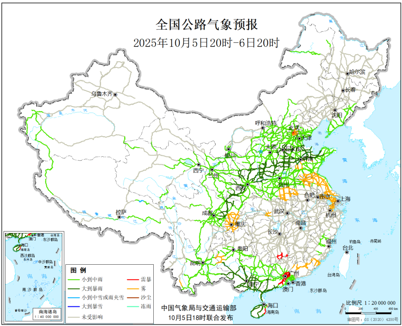 中国气象局与交通运输部2025年10月5日联合发布全国主要公路气象预报