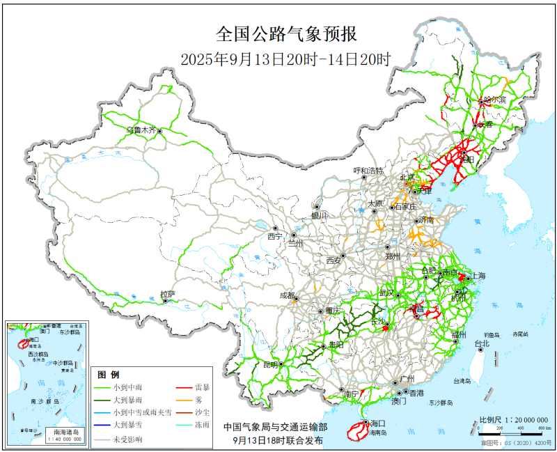 中国气象局与交通运输部2025年9月13日联合发布全国主要公路气象预报
