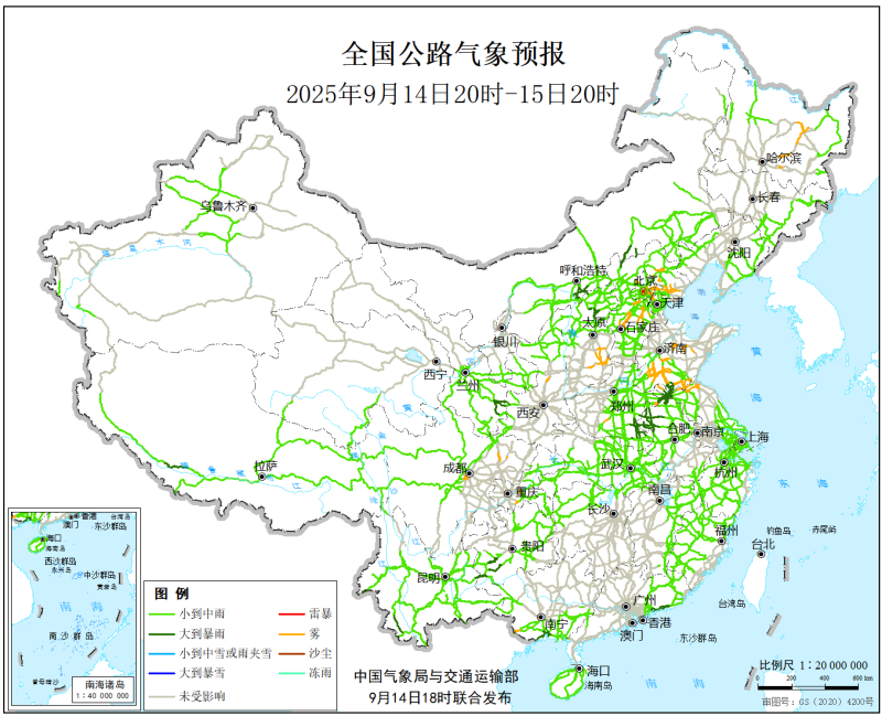 中国气象局与交通运输部2025年9月14日联合发布全国主要公路气象预报