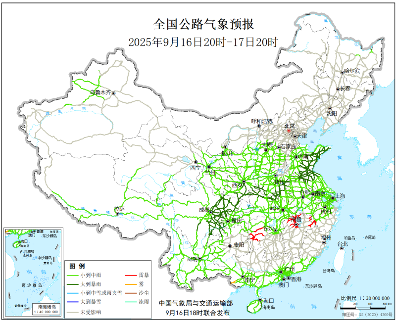 中国气象局与交通运输部2025年9月16日联合发布全国主要公路气象预报