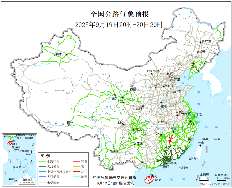 中国气象局与交通运输部2025年9月19日联合发布全国主要公路气象预报