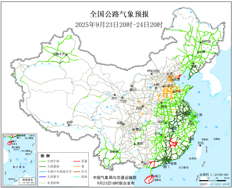 中国气象局与交通运输部2025年9月23日联合发布全国主要公路气象预报