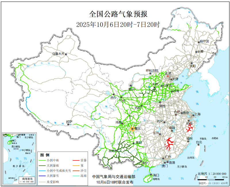 中国气象局与交通运输部2025年10月6日联合发布全国主要公路气象预报