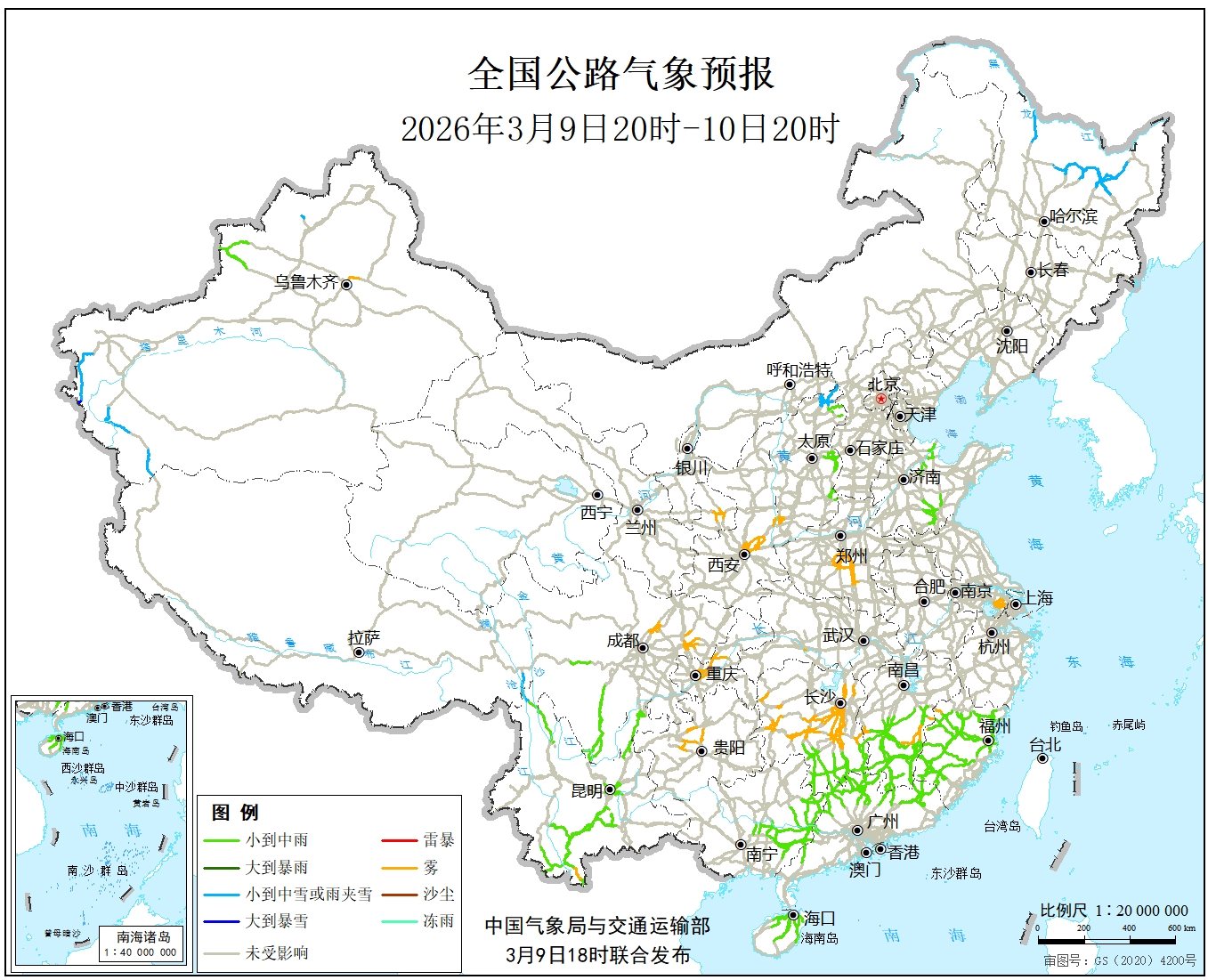 3月9日20时至10日20时,黑龙江北部、新疆西北部和南疆西部山区、西藏南部、川西高原南部等地部分地区有小到中雪或雨夹雪,其中,新疆南疆西部山区局地有大到暴雪。福建大部、江西中南部、湖南南部、广东北部和西部、广西东部、海南岛大部、四川南部、云南北部和南部等地部分地区有小到中雨。另外,山西西南部、江苏南部、江西中部、河南中部、湖南中部和北部、重庆西部、四川东北部、贵州西北部、云南南部、陕西中部、甘肃东部等地局地有雾。