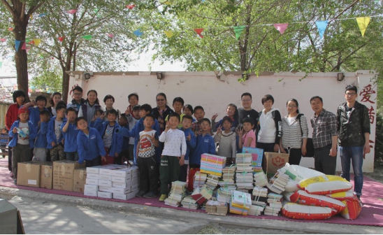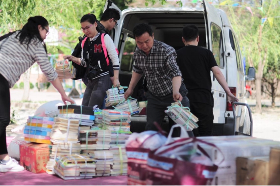 图为志愿者们为孩子们送上各类书籍和日常所需的生活用品。