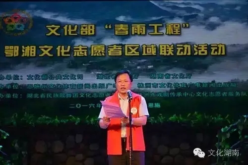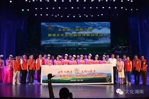 7月4日晚,“春雨工程”——湖湘文化志愿者边疆行深入文化部指定受援地区——湖北省恩施州,在民族大剧院拉开了以“湘鄂两地情 文化一家亲”为主题的文化志愿服务系列活动帷幕。湖南省文化厅党组副书记、副厅长禹新荣,恩施州人民政府副州长陈晓燕,湖北省文化厅党组成员、副厅长李耀华出席活动并讲话。两省文化厅公共文化处负责相关联络协调工作。