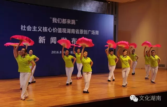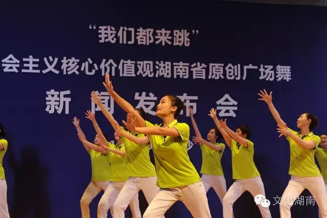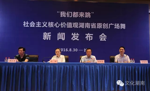 8月30日上午,湖南省人民政府新闻办在长沙召开新闻发布会,向社会发布20支“我们都来跳”社会主义核心价值观湖南省原创广场舞。湖南省文化厅党组书记、厅长李晖,湖南省文联副主席、省音协主席邓东源,湖南省文化馆党委书记叶伟平出席发布会并回答记者提问。会议由湖南省文化厅党组副书记、副厅长禹新荣主持。人民日报、新华社、新华网、人民网、中央人民广播电台、湖南卫视等40多家中央和省内媒体参加了新闻发布会。