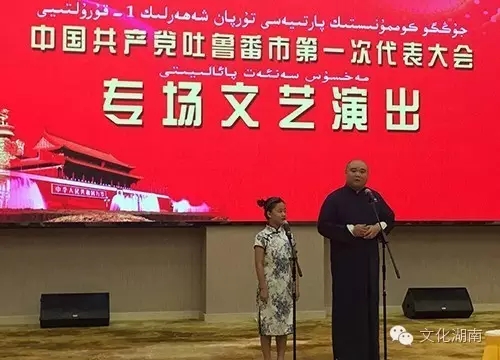 9月22日在喀什举办的“大讲台”上,长沙市文化志愿者、湖南师范大学音乐学院教授陈刚深入边陲,为喜爱歌唱的少数民族群众讲授歌唱的学习与自我训练技巧,让当地群众受益多多。9月24日在吐鲁番市鄯善县文化馆的“大舞台”上,湖南文化志愿者们专门为此次新疆行创作的器乐表演《湘疆情》,奏出了湘疆两地深厚情意;花鼓戏表演《刘海砍樵》、湘剧《沁园春·长沙》、女声独唱《浏阳河》、《马桑树儿搭灯台》等节目从不同角度展示了湖湘文化的独特魅力,受到鄯善县维吾尔族群众的热烈欢迎。诗歌朗诵《丝路畅想》、男声独唱《新疆是个好地方》、《吐鲁番的葡萄熟了》等节目则展现了新疆当地浓郁的民族特色。9月25日晚,文化志愿者们受邀为吐鲁番市第一次党代会专场演出,赢得党代表们的阵阵掌声。“大展台”则以国家级非物质文化遗产项目—湘绣精品展的形式,向吐鲁番和乌鲁木齐的群众展示精美的湘绣,绣品形象生动逼真,色彩鲜明,质感强烈,形神兼备,吸引了大批观众驻足观赏。新疆维吾尔自治区党委副书记、新疆生产建设兵团党委书记孙金龙陪同全国人大农业与农村委员会副主任委员、湖南省人大常委会主任徐守盛一行参观吐鲁番湘绣展。