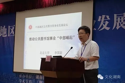会议邀请了文化部国家公共文化服务体系建设专家委员会主任、北京大学信息管理系李国新教授作题为《推动公共图书馆事业“中部崛起”》的主旨报告,报告以大量数据论证了公共图书馆发展的“中部洼地”现象的突出表现,呼吁政府、业界及全社会对这一问题的重视,从而让公共图书馆服务普遍均等、惠及全民的理念真正变为现实;湖南图书馆副馆长、《图书馆》执行主编王旭明随后发布了《中部地区公共图书馆事业发展数据分析报告》,该报告以数据说话,详细说明并论证了在当前中部地区公共图书馆面临的困难与问题,指出图书馆事业的进一步发展需要业界同仁更多的奋斗与热情。