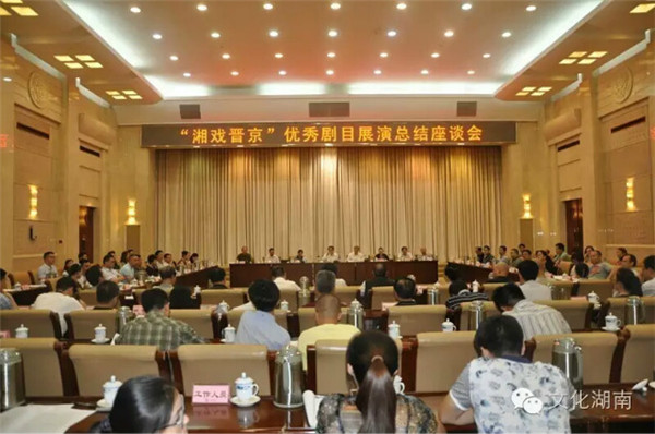为总结“湘戏晋京”展演活动的成功经验,进一步推动湖南文艺精品创作生产,9月27日下午,“湘戏晋京”优秀剧目展演总结座谈会在长沙召开。湖南省委常委、省委宣传部部长张文雄,湖南省政协副主席、省文联主席欧阳斌,湖南省文化厅党组书记、厅长李晖出席会议并讲话。湖南省委宣传部巡视员魏委主持会议。中国剧协《剧本》月刊原主编、著名评论家黎继德,中国戏曲学院戏文系主任、教授、中国戏剧文学学会副会长谢柏樑,省文联党组书记、副主席、秘书长夏义生,省文化厅副厅长鄢福初及省委宣传部、省文化厅、省文联、省演艺集团相关负责人和各参演单位所在市州党委宣传部分管领导、文(体)广新局分管领导、参演单位负责人、演出剧目主创人员代表、省直文艺院团负责人、部分专家、媒体代表参加了会议。