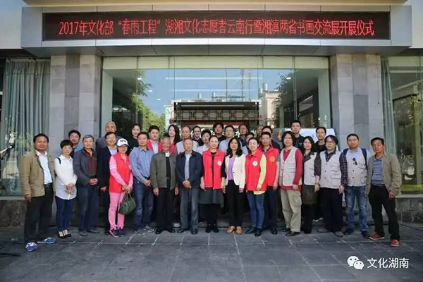 5月9日上午,“春雨工程”——湖湘文化志愿者云南行暨湘滇两省书画交流展在滇西抗战的主战场云南省腾冲市举行,拉开了两地书画艺术家文化志愿者艺术交流、文化互动,志愿服务工作互学互鉴的序幕。腾冲市政协主席郭芹,湖南省文化厅公共文化处负责人等出席展览启动仪式。株洲、长沙、湘潭文化志愿服务支队志愿者参加志愿服务活动。